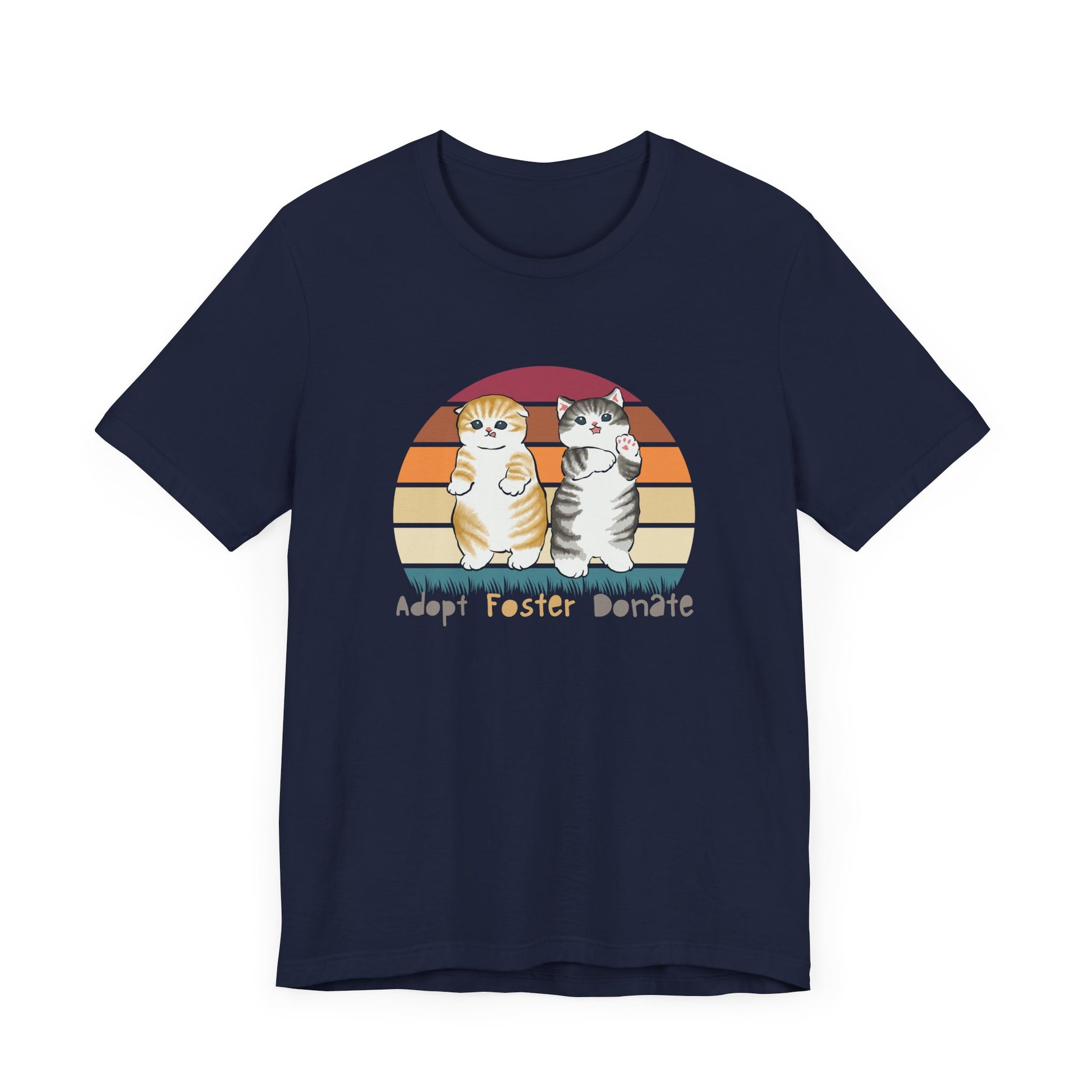 Spread an important message in the cutest way possible with this Adopt, Foster, Donate t-shirt! Featuring an adorable illustration of two cats against a retro-style sunset background, this tee is perfect for animal lovers, rescue advocates, and anyone passionate about helping pets in need.