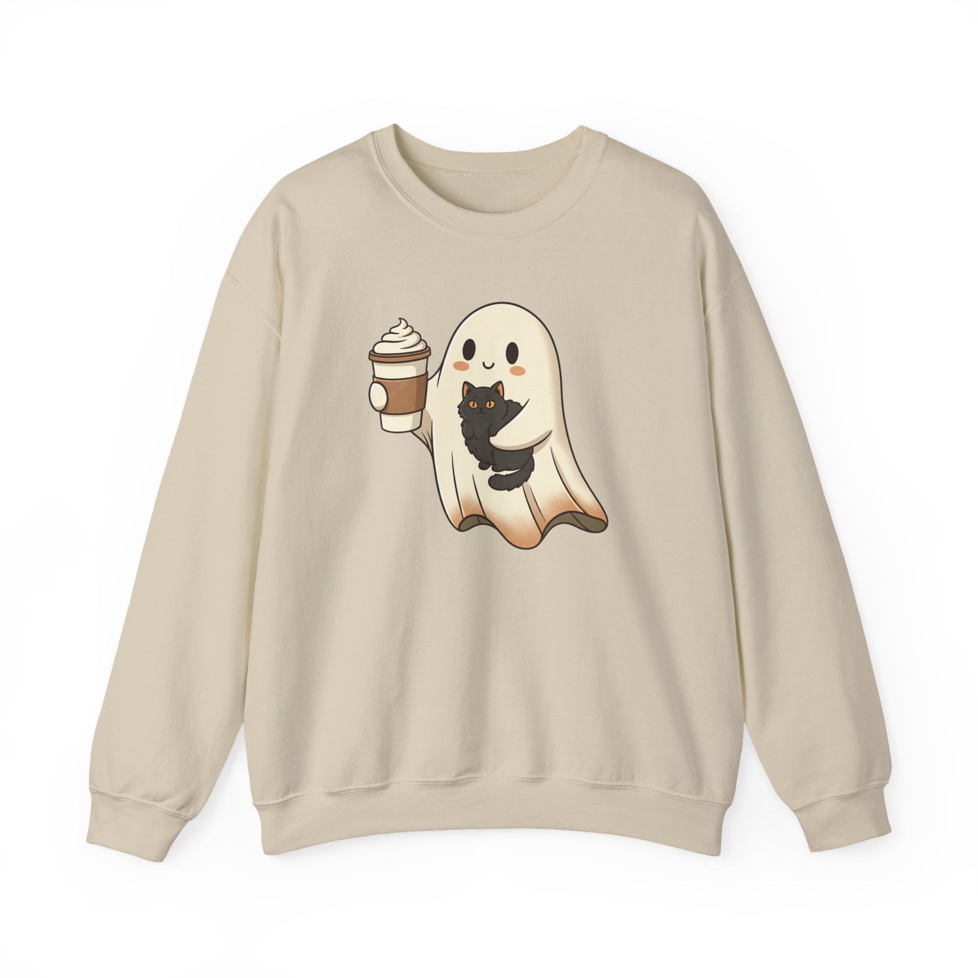 Ghost with Black Cat & Coffee Sweatshirt – Cute Halloween Crewneck, Spooky Season Fall Sweatshirt for Cat Lovers