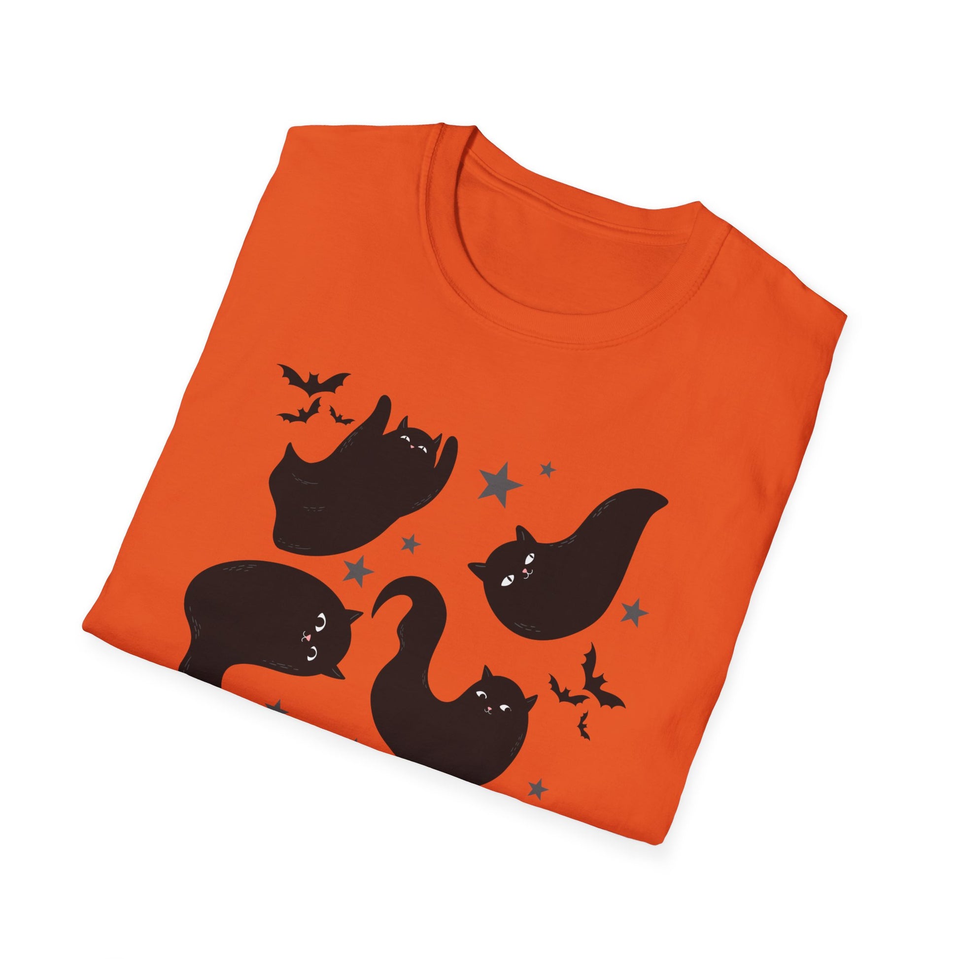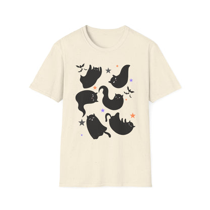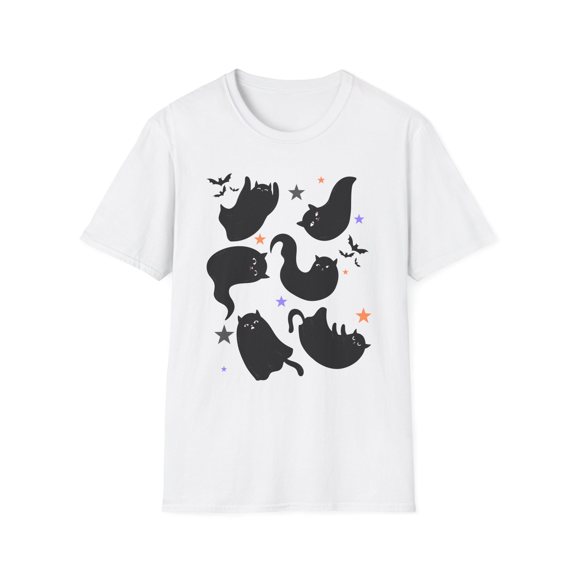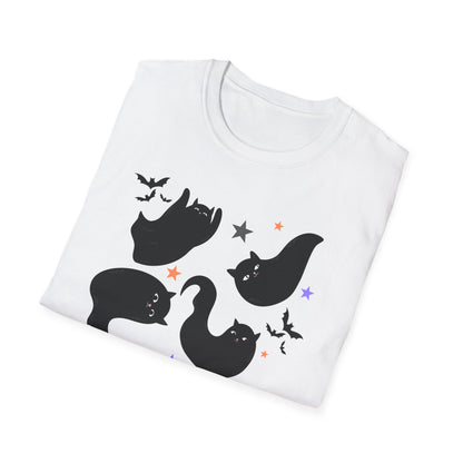 Bring some playful Halloween vibes to your wardrobe with this cute black cat t-shirt! Featuring adorable ghost-like black cats surrounded by bats and stars, this spooky season shirt is the perfect mix of festive and fun. Whether you’re heading to a pumpkin patch, hosting a Halloween party, or just looking for a cozy fall outfit, this tee is a must-have for cat lovers and Halloween fans alike.