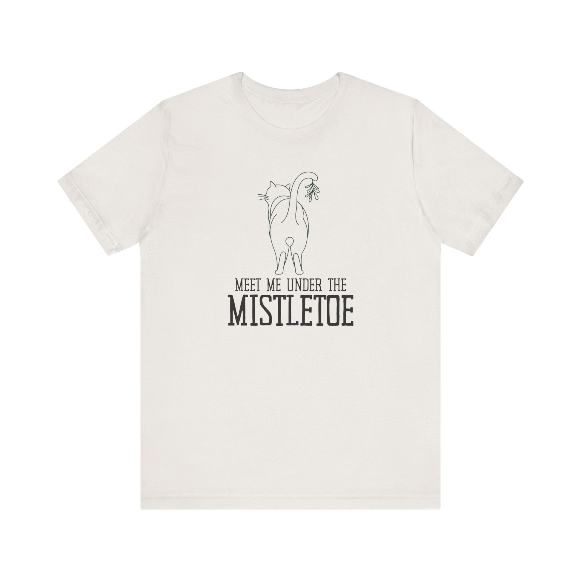 Looking for a holiday tee that brings a laugh and a raised eyebrow? This cheeky tee features a cat with its tail raised high, proudly holding a mistletoe. The message? “Meet Me Under the Mistletoe” – a bold invitation from the sassiest feline around. Perfect for cat lovers who appreciate a touch of humor and mischief in their wardrobe. Wear it to your next holiday party and watch the room light up with giggles (and maybe a few blushes)!